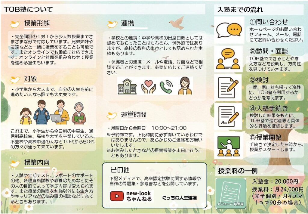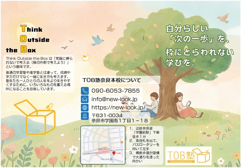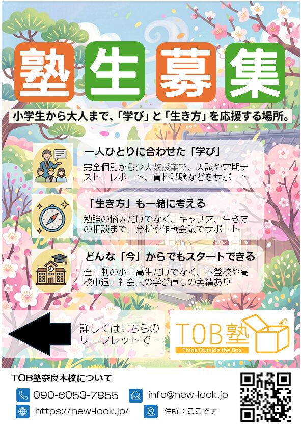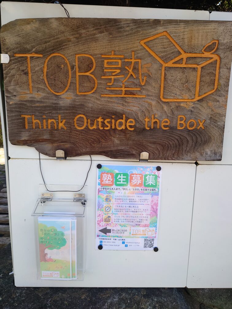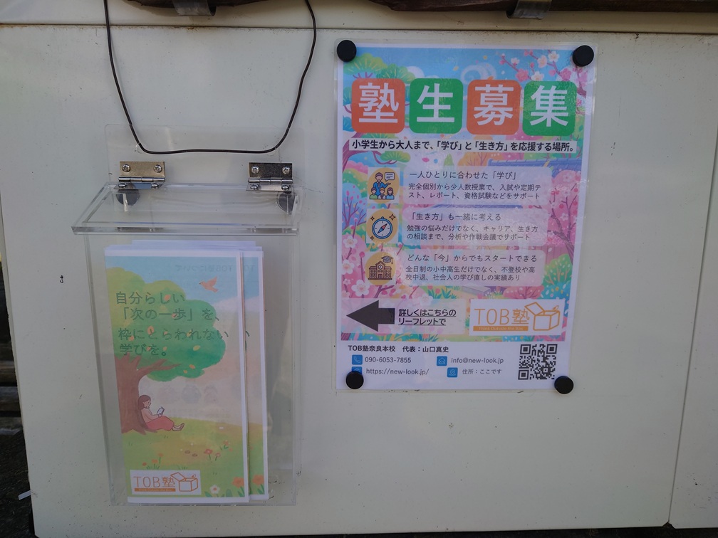 看板にリーフレット設置しました 2026年3月10日 最終更新日時 : 2026年4月12日 yamaguchi 新しいことをやるためには、相応の準備期間が必要ですね。という言い訳はそこそこに、ついに「ご自由にお取りください」のケースとリーフレットを導入いたしました。 それに伴って、塾生募集のポスターも新しくなりました。次は夏verでしょうか。そのころにはどんなTOB塾に、new-lookになっているのか。楽しみです。 【リーフレット表裏】 【ポスター2026春】 \ 最新情報をチェック / FacebookXBlueskyHatenaCopy