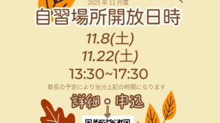 11月土曜日の自習場所開放日についてお知らせです。山口の予定の都合で、しばらく13:30~17:30の時間になります。 【11月の自習】【利用は無料です】・11月8日(土)13時30分-17時30分・11月22日(土)1 […]